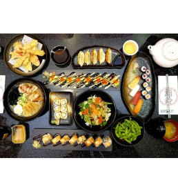 8 Pieces of special crunchy prawn rolls, 8 pieces of salmon & avocado inside out rolls, 8 pieces of cucumber & avocado inside out rolls, 1 piece of spicy tuna hand rolls, 4 pieces of salmon nigiri, pieces of prawn nigiri, 5 pieces of salmon sashimi & 5 pieces of tuna shim Contains: soy fish sesame gluten wheat shellfish eggs fish eggs