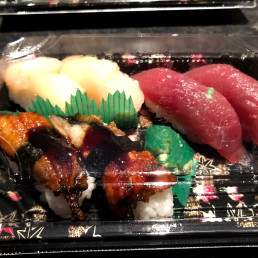 3 pieces of salmon maki, 3 pieces of tuna maki, 2 pieces of salmon nigari, 2 pieces of tuna nigari, 2 pieces of salmon sashimi 2 pcs of tuna sashimi Contains: soy fish gluten wheat